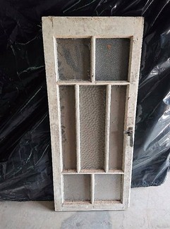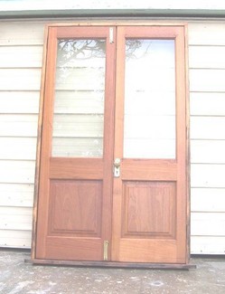 Solid timber door set with matching frame., made with good timber. The frame is 211 cm tall and 129.5 cm wide on the outside. Each door is 60 cm wide and are hinged at the right and left side on the frame. Ready to install $ 150.- 17 Colonial type windows already 50 years in service and like to go another 50. Removed from a stucco home. Made of good quality timber. Each panel is 121 cm by 47 cm. Most of t